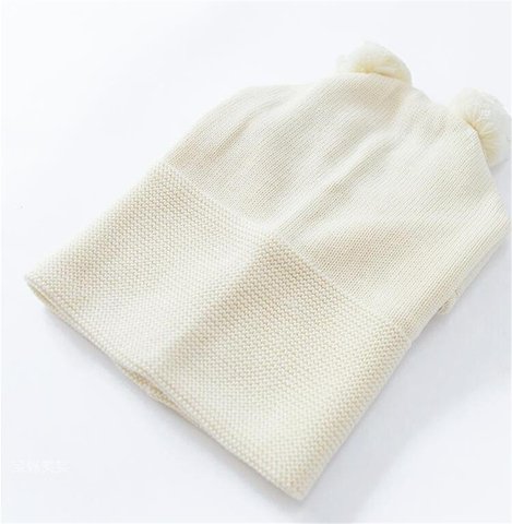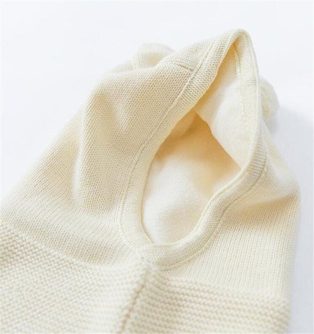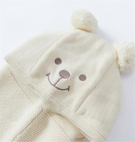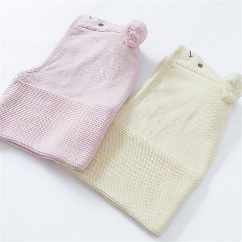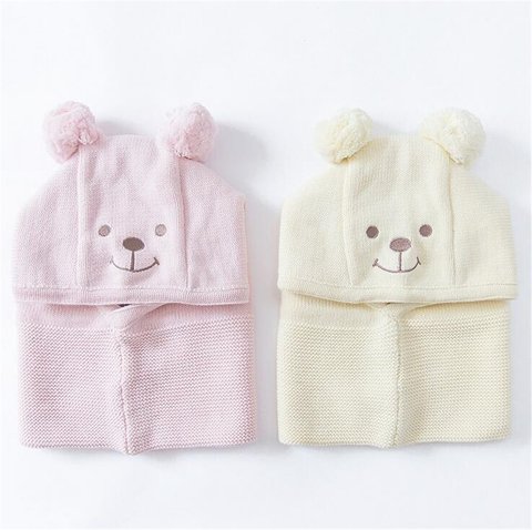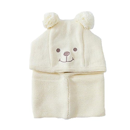 LeafIn 綿100%ニット帽 ネックウォーマー 子供用 クマちゃんキッズハット ボンボンつき(S(頭周り:46-50cm), ベージュ)