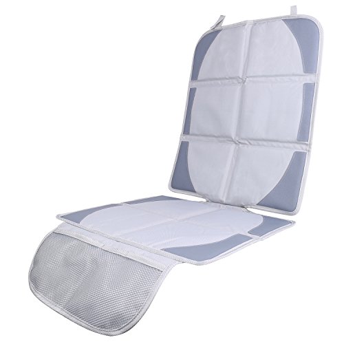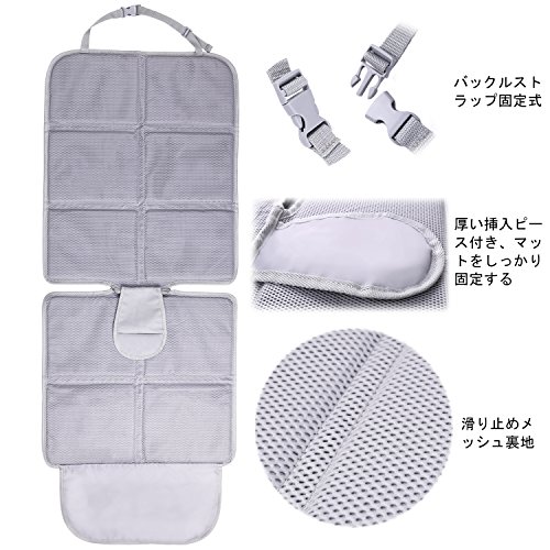 チャイルドシートマット カーシートカバー ベビーカーシートプロテクター 車保護シートカバー厚め MOTOUE ジュニアシート クッション 滑り止め メッシュのコンビポケット付き (グレー)