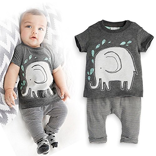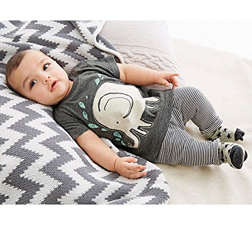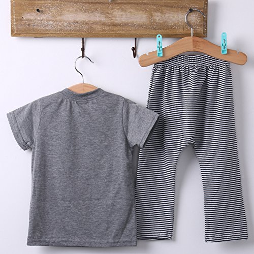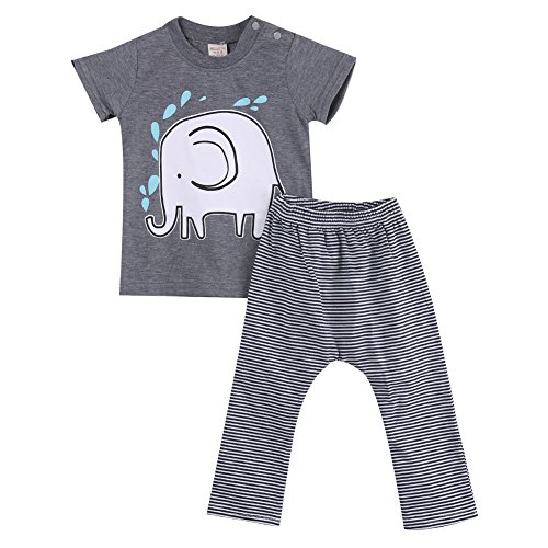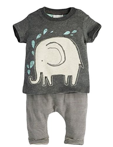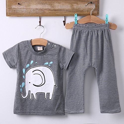 CANIS 男の子 ルームウェア ゾウパターン 半袖 Tシャツ&ズボン 上下セット 灰色 グレー ストライプ 縞模様 夏 0-24ヶ月設定 (80)