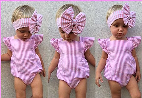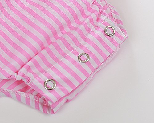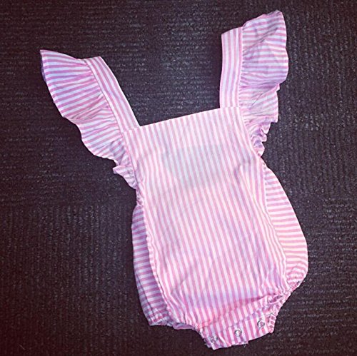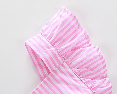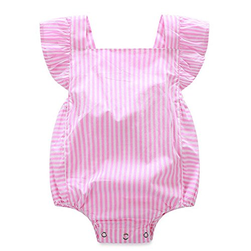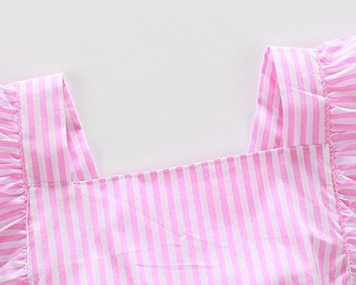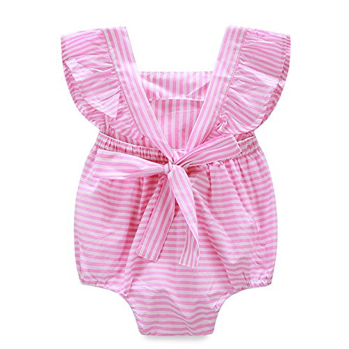 CANIS ベビー 女の子 ロンパース 縦縞 ストライプ 縞模様 ピンク ふわふわ 飛び袖 夏服 無地 可愛い シンプル 0-18ヶ月設定 リボン 蝶結び カバーオール 誕生日 プレゼント (100)