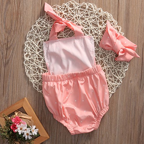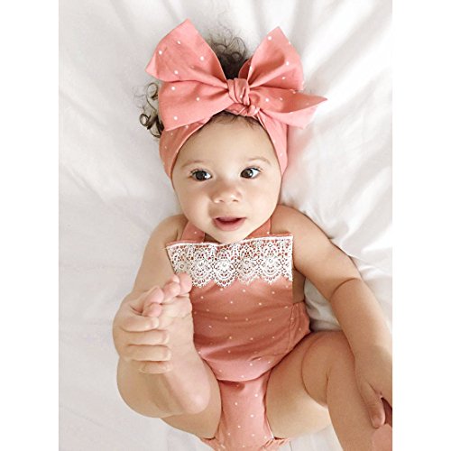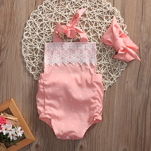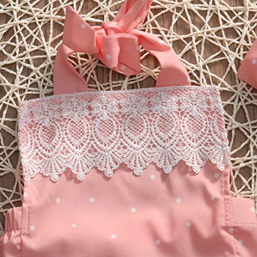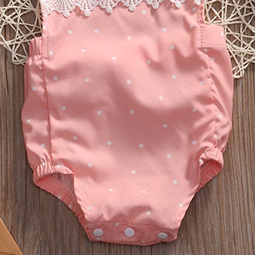 Canis 子供 女の子 レース 水玉柄 ロンパース かわいい 姫風 ドット リボン付き 2点セット オーバーオール ピンク 夏 (100)