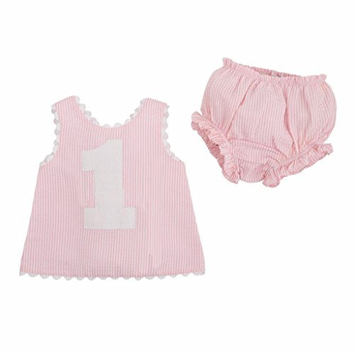 このツーピースピンクでLittle DIVAはキュートに見え、快適を設定されている場合があります。Aラインの背面がric-racトリム、および開いた花びらのピンクシアサッカージャンパーとタイやタック構築された大きなリボンが特徴。それは白いシアサッカー" 1 "のアップリケ。一致したシアサッカーブルマーが伸縮性ウエストバンドと脚の開口部の追加されたために快適さを提供します。この作品でも大活躍お子様の最初のギフトに