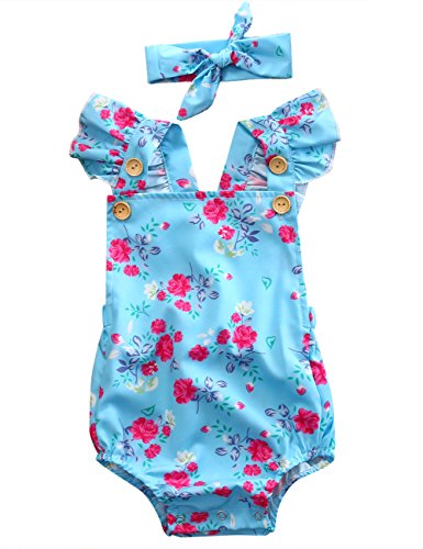 MUSTY ベビー 女の子 花柄 ロンパース 可愛い リボン 付き ふわふわ 飛び袖 ボタン カバーオール ライトブルー (80)