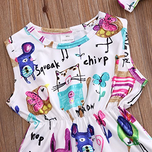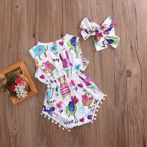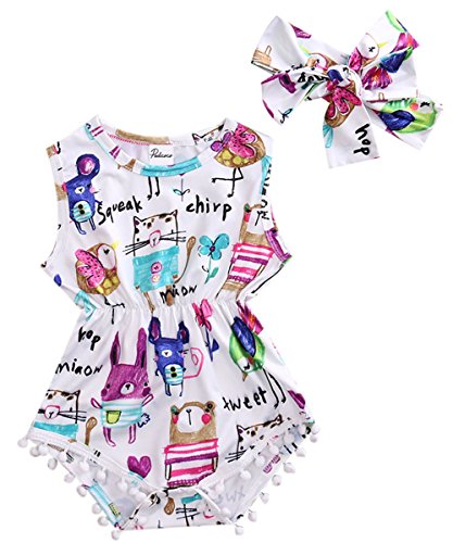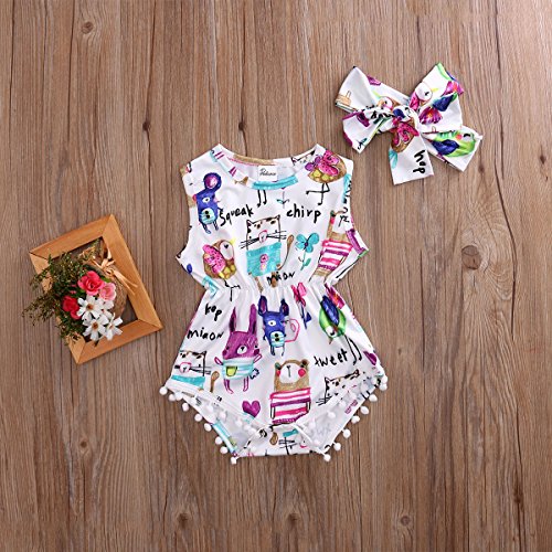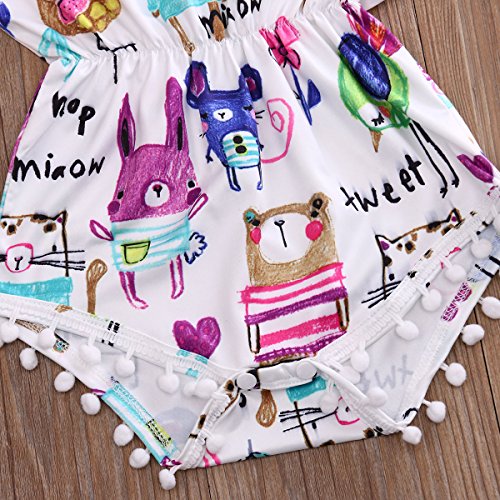 MUSTY 女の子 ノースリーブ ロンパース ワンピース リボン 付き 2点ゼット 動物プリント ウサギ 小鳥 小猫 0~3歳 ホワイト 夏 (70)