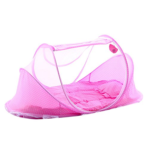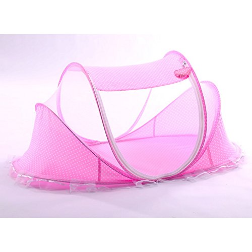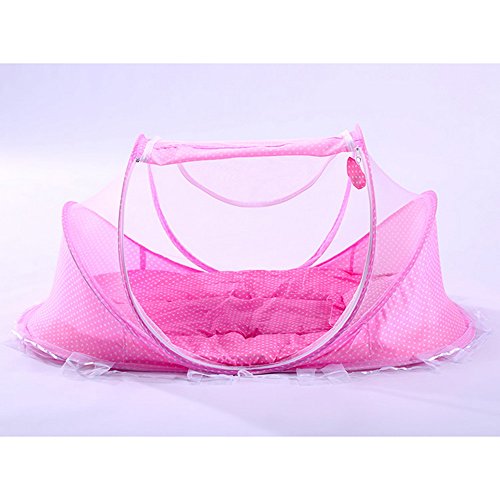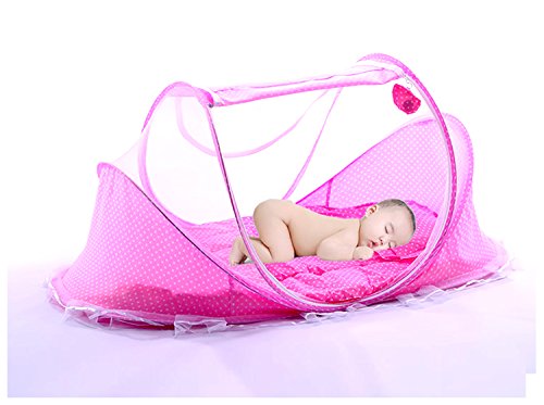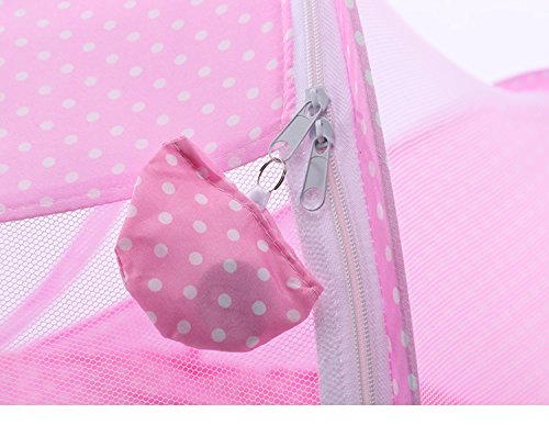 URIJK ベビー蚊帳 折りたたみ式 ワンタッチ 底付き 虫よけ ムカデ対策 蚊帳+ベビーマット+枕+音楽バッグ 4件セット 赤ちゃん蚊帳 コンパクト収納 携帯便利 通気 安眠 ベビー蚊帳ミニ (ピンク)