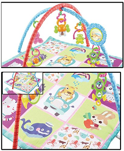 - おねんね、はらばい、指遊びの3つのしかけ!運動能力と体の調和力を練習できます。また、付属されているおもちゃは、カラカラ、キューキュー、色々な音が楽しめます。明るいマットは、お子様の好奇心や発見する力を刺激します。