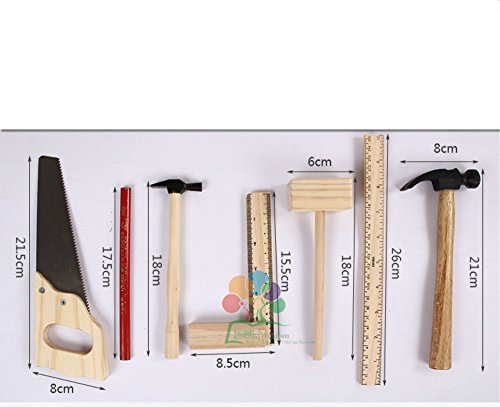 - セット内容:ハサミや定規、ハンマーやのこぎり、ねじやボルトなど木で出来た大工セット。