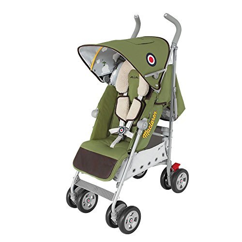 Appropriate from birth up to 55lbs With a simple one-hand recline, the buggy seat reclines to 4 different positions. It also offers a cocooning Newborn Safety System and an extendable leg rest. New branding outlook to reflect genre font;New fabric shopping basket, back pocket design and seat template with antique faux leather details Cloisonne buckle rink w/roundel and custom wheel design w/cloisonne rounded Centre Whimsical aero plane pattern lining on inside hood and back viewing window;50th anniversary coin insert on hood tensioners Luxurious leather handles Aviator fashion-inspired cosseting head hugger and shoulder pads included: coordination footmuff in antique faux leather printed rain cover and rain cover storage punch, buggy ID Tag