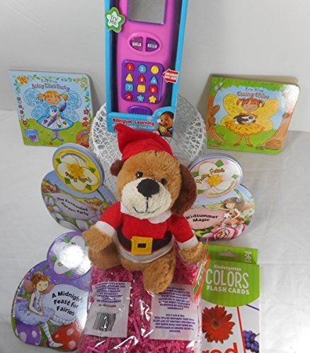 子供のおもちゃギフトバスケット – ブラウンぬいぐるみSanta Bear、二か国語学習Musical電話、Pretty Petals & Fairy Wings Books、色Flashcards、ホワイトワイヤバスケットwtih装飾Shredsバンドル