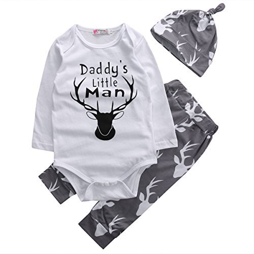 男の赤ちゃん用 Daddy's Little Man 長袖ボディースーツと鹿模様のズボンと帽子のセット カラー: ホワイト