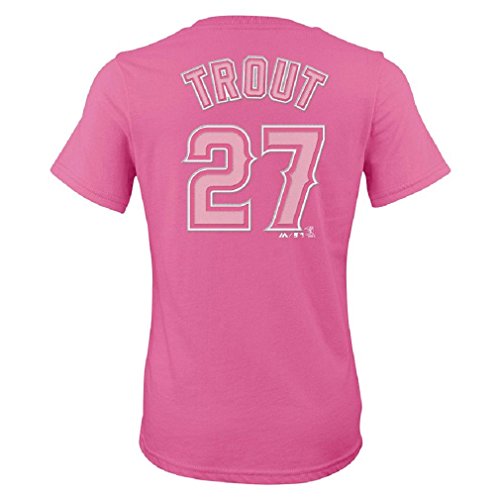 当社の若い野球ファンであるドレスアップを好む彼女の大好きなプレーヤー、マイクトラウトからANAそして今、実現するには、それは彼女に自宅に帰ったらこのマイク・トラウトロサンゼルス・エンゼルスの選手名と番号Tシャツマジェスティックから。その特長は驚きのロサンゼルスエンゼルス全面グラフィックと背番号, # 27 ,背面のすべてが、かわいいピンクを。