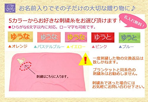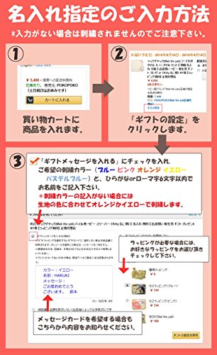 - 【名入れ刺繍をするには】商品をカートに入れた後、「ギフト設定」をクリック。「ギフトメッセージ」欄にてご希望の刺繍の色(オレンジ、イエロー、ブルー、ピンク、パステルブルー)と名前(平仮名もしくはローマ字6文字以内)をお知らせください。分かりづらい場合、ご注文者様のお名前をご記入頂いた上、メール(pokopoko@maktheyak.jp)もしくはお電話(053-452-1899)でお知らせ下さい。【カラーのご希望がない場合】生地に合わせ「イエロー」または「オレンジ」色での刺繍となります。これら記載がない場合は刺繍されませんのでご注意下さい。(一度刺繍した物の返品交換は致しかねます)