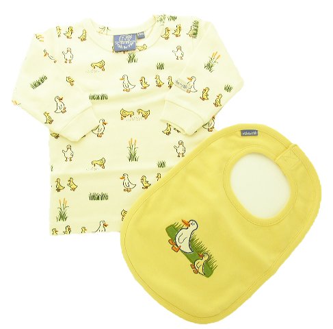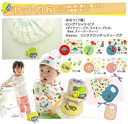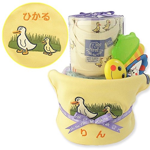 マックザヤック(Mak the yak) おむつケーキ / ロング Tシャツ / ビブ / sassy おもちゃ 【4商品のセット】 【 刺繍 名入れ 無料 】 出産祝い ベビー ギフト プレゼント (6-12M/80cm)(アヒル柄) ( おむつ Mサイズ 7枚) 【 ラッピング イエロー】 名入れあり