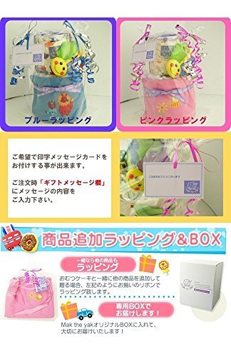 - ■おむつケーキの色に合ったリボンでラッピングします。印字メッセージカードの添付も可能です。いずれも無料サービスです!