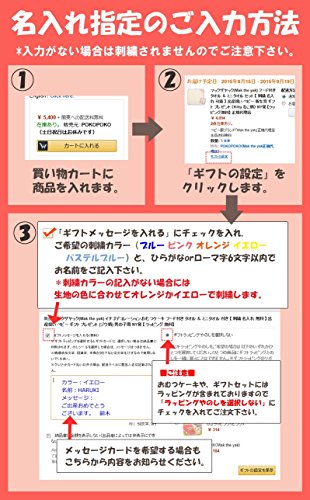 - 【名入れ刺繍をするには】商品をカートに入れた後、「ギフトメッセージ」欄にてご希望の「刺繍の色」と「名前(6文字以内)」をお知らせください。分かりづらい場合、ご注文者様のお名前をご記入頂いた上、メール(pokopoko@maktheyak.jp)もしくはお電話(053-452-1899)でお知らせ頂いても結構です。【カラーのご希望がない場合】生地に合わせ「イエロー」または「オレンジ」色での刺繍となります。※注意:この商品にはラッピングが含まれておりますので、ご注文時ラッピングの選択は不要です。
