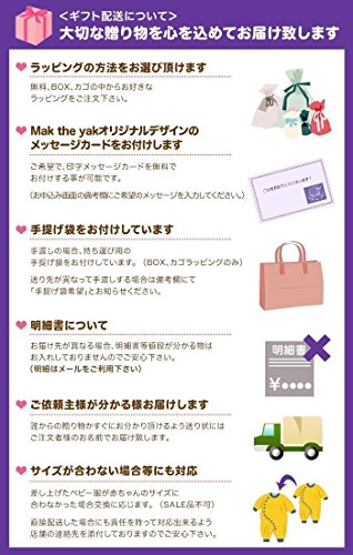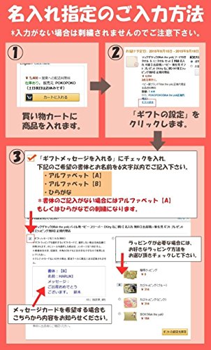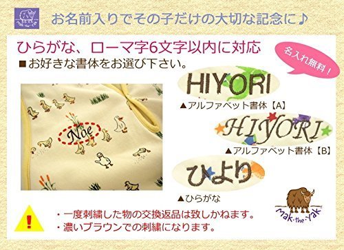 - 【名入れ刺繍をするには】商品をカートに入れた後、「ギフト設定」をクリック。「ギフトメッセージ」欄にてご希望の刺繍の書体と名前(6文字以内)をお知らせください。書体のご希望がない場合、『アルファベット書体【A】』または『ひらがな』での刺繍となります。分かりづらい場合、ご注文者様のお名前をご記入頂いた上、メール(pokopoko@maktheyak.jp)もしくはお電話(053-452-1899)でお知らせ下さい。(名入れに関しての記載がない場合には刺繍はされません)