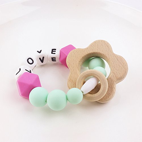 Mamimami Home 木育 授乳ジュエリー 歯がため ラトル 赤ちゃんのおもちゃ 歯固め フラワー チュアブル ブレスレット クラスプ シリコン レタービーズ[BPAフリー][FDA認可済]木製 安全 無味 ピンク シント