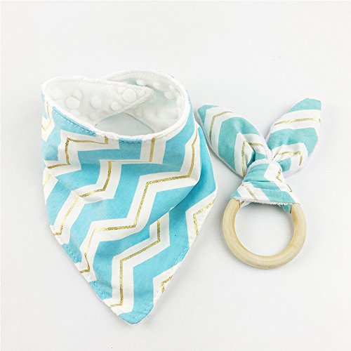 2枚セット オーガニックコットン/歯固め木製リング 赤ちゃんのトライアングル よだれかけ /シェブロン バンダナ ママ授乳ジュエリー お手てにピッタリブレスレット[食品レベル][BPAフリー]ブルー ストライプ