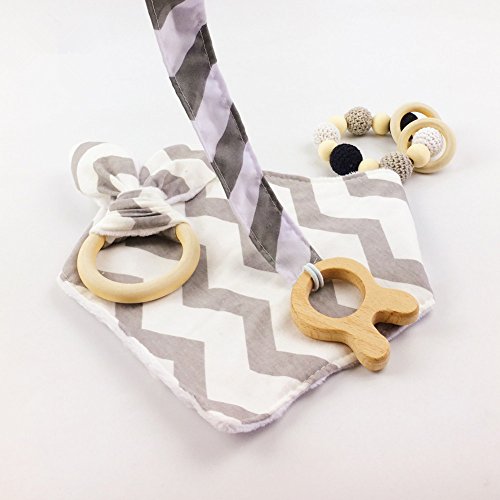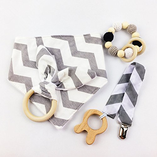木育 歯固めおもちゃ シリコン ブレスレット 赤ちゃんのよだれ吸収 スタイ バンダナ ビブ セット ママ授乳ジュエリー[BPAフリー][FDA認可済]木製 安全 無味 グレー 4枚セット
