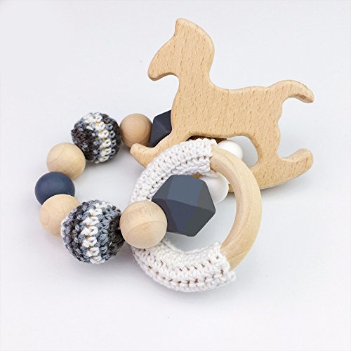 Mamimami Home 歯固め 木製 ブレスレット 可愛い 木馬の形 ガラガラ 木育 歯がため おしゃぶり かぎ針編みリング かぎ針編みビーズ 知育玩具 出産祝い 新生児贈り物 男の子 女の子 [BPAフリー][FDA認可済]