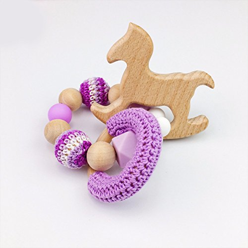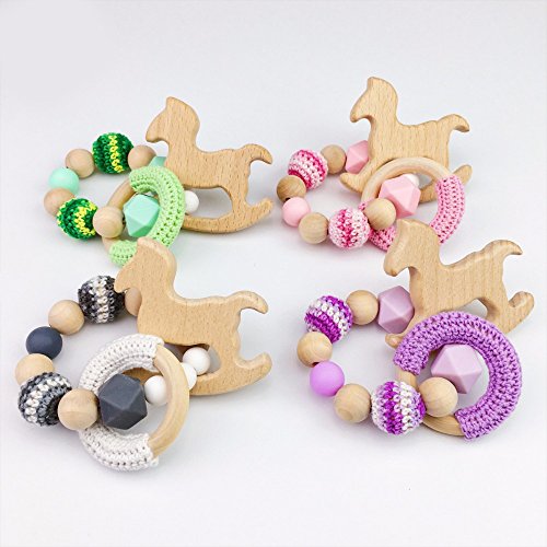 Mamimami Home 歯固め 木製 ブレスレット 可愛い 木馬の形 ガラガラ 木育 歯がため おしゃぶり かぎ針編みリング かぎ針編みビーズ 知育玩具 出産祝い 新生児贈り物 男の子 女の子 4個/ゼント [BPAフリー][FDA認可済]