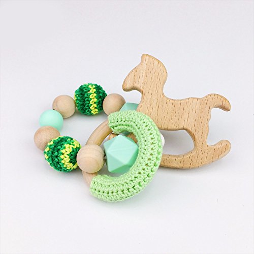 Mamimami Home 歯固め 木製 ブレスレット 可愛い 木馬の形 ガラガラ 木育 歯がため おしゃぶり かぎ針編みリング かぎ針編みビーズ 知育玩具 出産祝い 新生児贈り物 男の子 女の子 [BPAフリー][FDA認可済]