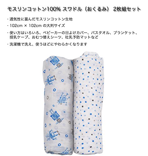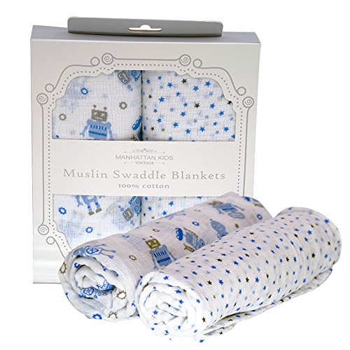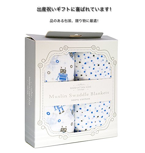 Manhattan Kids おくるみ モスリンコットン製 スワドル 2枚セット ダブルガーゼ 出産祝い 赤ちゃん バスタオル ベビー ブランケット 新生児 ガーゼタオル 綿100% 毛布 箱入り 102cm×102cm (ロボット・星/2 Pack)