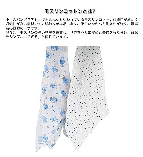 ●出産祝いギフトに喜ばれています。品のある包装、贈り物に最適!●通気性があり快適で赤ちゃんのお肌にも安心。軽くて柔らかいモスリンは通気性が高く、適度な温度を保つことができます。●耐久性が強く、使えば使うほどお肌になじみます。モスリンコットンは耐久性の強い素材でお洗濯の度に柔らかく、肌触りが良いという特性があります。●柔らいながらも耐久性が強い。デリケートでありながら長持ちするモスリンの織り目が、自然な伸縮性に凄れているので、赤ちゃんを締め付け過ぎず、適度な遊びをもたせることができる最適なおくるみです。●1枚で何役もこなす優れもの、非常に多くの用途。大判なのでおくるみとしてだけではなく、授乳ケープ、バスタオル、ブランケット、ベビーカーの日よけ、吐乳予防マット、オムツ替え時のシートとして、使用していただけます。