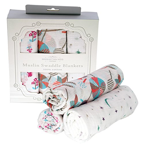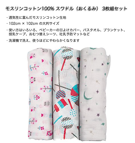Manhattan Kids おくるみ モスリンコットン製 スワドル 3枚セット ダブルガーゼ 出産祝い 赤ちゃん バスタオル ベビー ブランケット 新生児 ガーゼタオル 綿100% 毛布 箱入り 102cm×102cm (フクロウ・キャンデー・星月/3 Pack)