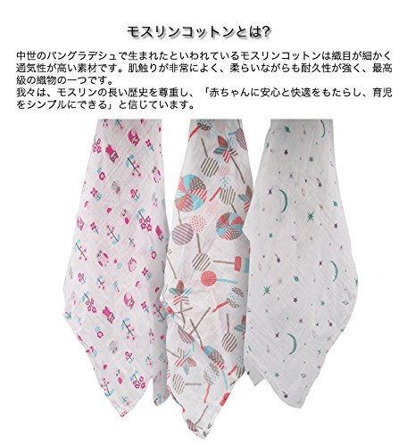 ●出産祝いギフトに喜ばれています。品のある包装、贈り物に最適!●通気性があり快適で赤ちゃんのお肌にも安心。軽くて柔らかいモスリンは通気性が高く、適度な温度を保つことができます。●耐久性が強く、使えば使うほどお肌になじみます。モスリンコットンは耐久性の強い素材でお洗濯の度に柔らかく、肌触りが良いという特性があります。●柔らいながらも耐久性が強い。デリケートでありながら長持ちするモスリンの織り目が、自然な伸縮性に凄れているので、赤ちゃんを締め付け過ぎず、適度な遊びをもたせることができる最適なおくるみです。●1枚で何役もこなす優れもの、非常に多くの用途。大判なのでおくるみとしてだけではなく、授乳ケープ、バスタオル、ブランケット、ベビーカーの日よけ、吐乳予防マット、オムツ替え時のシートとして、使用していただけます。