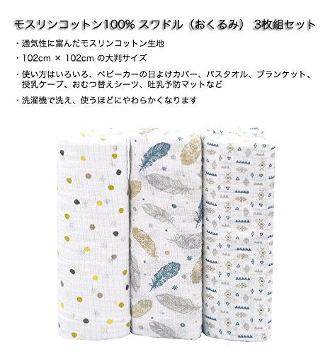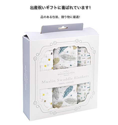 Manhattan Kids おくるみ モスリンコットン製 スワドル 3枚セット ダブルガーゼ 出産祝い 赤ちゃん バスタオル ベビー ブランケット 新生児 ガーゼタオル 綿100% 毛布 箱入り 102cm×102cm (水玉・羽毛・シンボル/3 Pack)