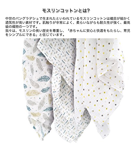 ●出産祝いギフトに喜ばれています。品のある包装、贈り物に最適!●通気性があり快適で赤ちゃんのお肌にも安心。軽くて柔らかいモスリンは通気性が高く、適度な温度を保つことができます。●耐久性が強く、使えば使うほどお肌になじみます。モスリンコットンは耐久性の強い素材でお洗濯の度に柔らかく、肌触りが良いという特性があります。●柔らいながらも耐久性が強い。デリケートでありながら長持ちするモスリンの織り目が、自然な伸縮性に凄れているので、赤ちゃんを締め付け過ぎず、適度な遊びをもたせることができる最適なおくるみです。●1枚で何役もこなす優れもの、非常に多くの用途。大判なのでおくるみとしてだけではなく、授乳ケープ、バスタオル、ブランケット、ベビーカーの日よけ、吐乳予防マット、オムツ替え時のシートとして、使用していただけます。