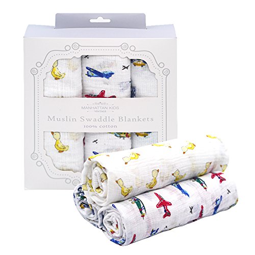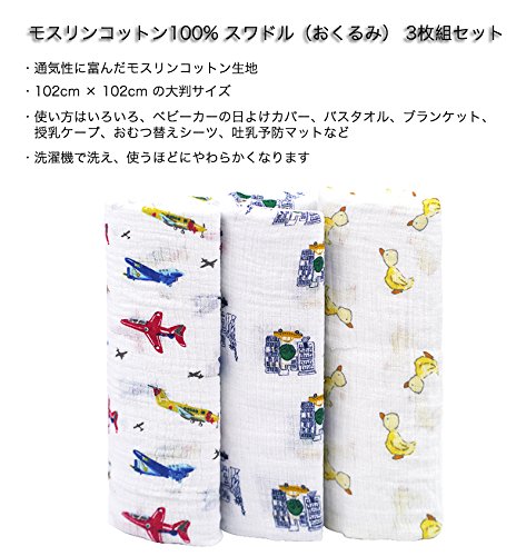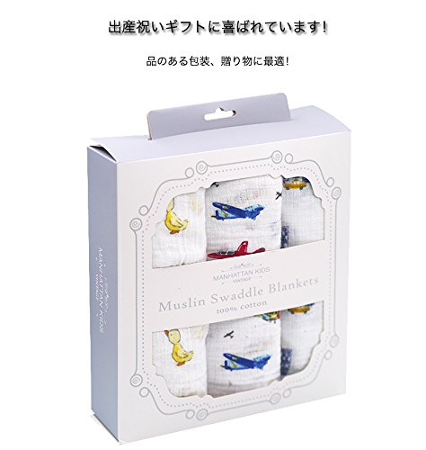 Manhattan Kids おくるみ モスリンコットン製 スワドル 3枚セット ダブルガーゼ 出産祝い 赤ちゃん バスタオル ベビー ブランケット 新生児 ガーゼタオル 綿100% 毛布 箱入り 102cm×102cm (アヒル・飛行機・都市/3 Pack)