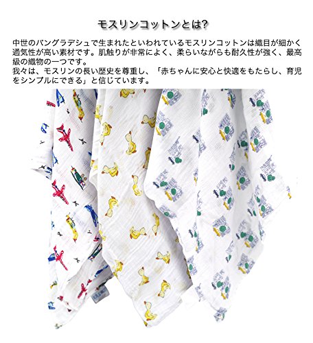 ●出産祝いギフトに喜ばれています。品のある包装、贈り物に最適!●通気性があり快適で赤ちゃんのお肌にも安心。軽くて柔らかいモスリンは通気性が高く、適度な温度を保つことができます。●耐久性が強く、使えば使うほどお肌になじみます。モスリンコットンは耐久性の強い素材でお洗濯の度に柔らかく、肌触りが良いという特性があります。●柔らいながらも耐久性が強い。デリケートでありながら長持ちするモスリンの織り目が、自然な伸縮性に凄れているので、赤ちゃんを締め付け過ぎず、適度な遊びをもたせることができる最適なおくるみです。●1枚で何役もこなす優れもの、非常に多くの用途。大判なのでおくるみとしてだけではなく、授乳ケープ、バスタオル、ブランケット、ベビーカーの日よけ、吐乳予防マット、オムツ替え時のシートとして、使用していただけます。