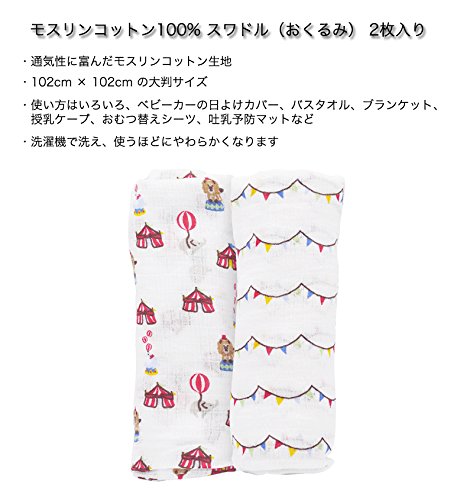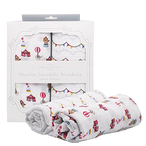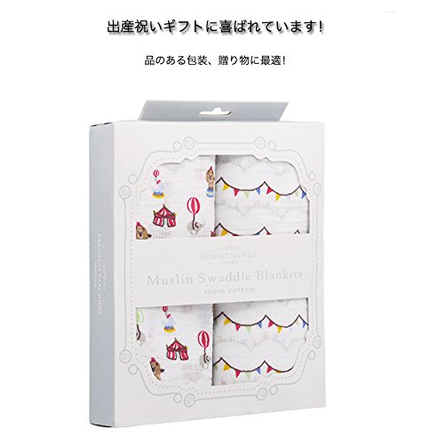 Manhattan Kids おくるみ モスリンコットン製 スワドル 2枚セット ダブルガーゼ 出産祝い 赤ちゃん バスタオル ベビー ブランケット 新生児 ガーゼタオル 綿100% 毛布 箱入り 102cm×102cm (サーカス・旗/2 Pack)