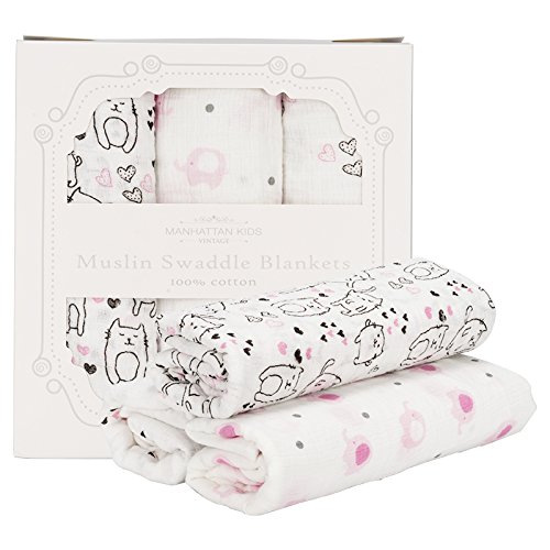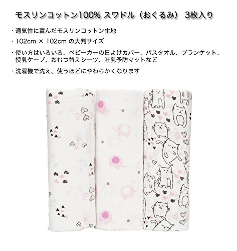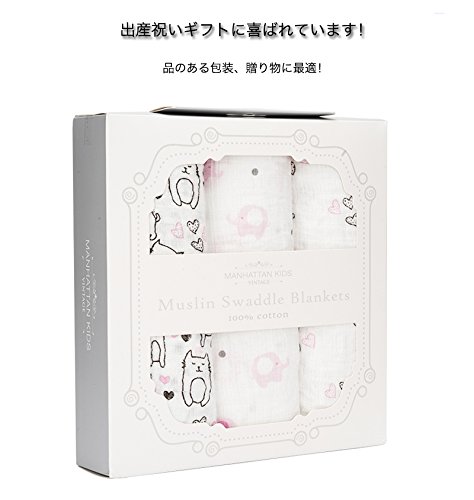 Manhattan Kids おくるみ モスリンコットン製 スワドル 3枚セット ダブルガーゼ 出産祝い 赤ちゃん バスタオル ベビー ブランケット 新生児 ガーゼタオル 綿100% 毛布 箱入り 102cm×102cm (ハート・象・猫/3 Pack)