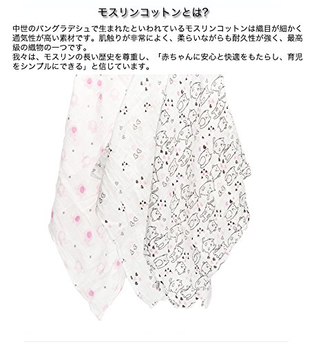 ●出産祝いギフトに喜ばれています。品のある包装、贈り物に最適!●通気性があり快適で赤ちゃんのお肌にも安心。軽くて柔らかいモスリンは通気性が高く、適度な温度を保つことができます。●耐久性が強く、使えば使うほどお肌になじみます。モスリンコットンは耐久性の強い素材でお洗濯の度に柔らかく、肌触りが良いという特性があります。●柔らいながらも耐久性が強い。デリケートでありながら長持ちするモスリンの織り目が、自然な伸縮性に凄れているので、赤ちゃんを締め付け過ぎず、適度な遊びをもたせることができる最適なおくるみです。●1枚で何役もこなす優れもの、非常に多くの用途。大判なのでおくるみとしてだけではなく、授乳ケープ、バスタオル、ブランケット、ベビーカーの日よけ、吐乳予防マット、オムツ替え時のシートとして、使用していただけます。