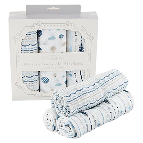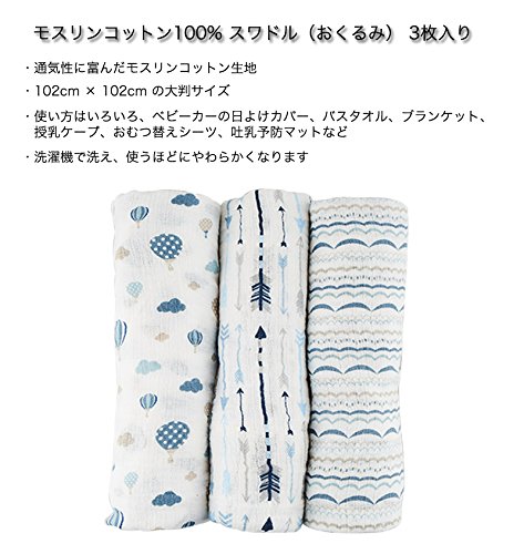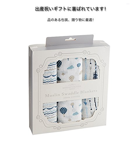 Manhattan Kids おくるみ モスリンコットン製 スワドル 3枚セット ダブルガーゼ 出産祝い 赤ちゃん バスタオル ベビー ブランケット 新生児 ガーゼタオル 綿100% 毛布 箱入り 102cm×102cm (熱気球・波浪・矢/3 Pack)