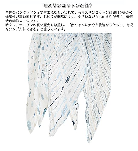 ●出産祝いギフトに喜ばれています。品のある包装、贈り物に最適!●通気性があり快適で赤ちゃんのお肌にも安心。軽くて柔らかいモスリンは通気性が高く、適度な温度を保つことができます。●耐久性が強く、使えば使うほどお肌になじみます。モスリンコットンは耐久性の強い素材でお洗濯の度に柔らかく、肌触りが良いという特性があります。●柔らいながらも耐久性が強い。デリケートでありながら長持ちするモスリンの織り目が、自然な伸縮性に凄れているので、赤ちゃんを締め付け過ぎず、適度な遊びをもたせることができる最適なおくるみです。●1枚で何役もこなす優れもの、非常に多くの用途。大判なのでおくるみとしてだけではなく、授乳ケープ、バスタオル、ブランケット、ベビーカーの日よけ、吐乳予防マット、オムツ替え時のシートとして、使用していただけます。
