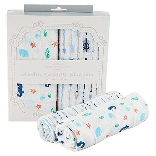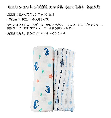 Manhattan Kids おくるみ モスリンコットン製 スワドル 2枚セット ダブルガーゼ 出産祝い 赤ちゃん バスタオル ベビー ブランケット 新生児 ガーゼタオル 綿100% 毛布 箱入り 102cm×102cm (タツノオトシゴ・矢/2 Pack)