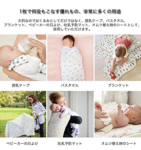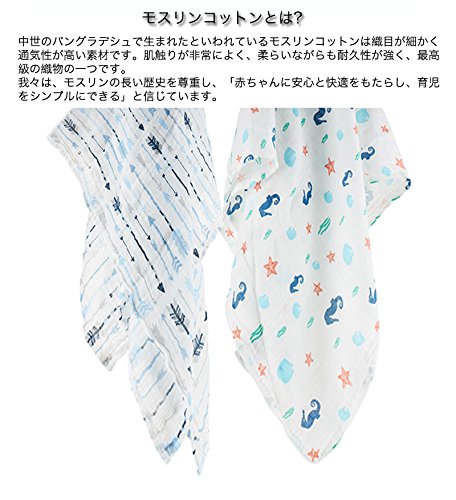 ●出産祝いギフトに喜ばれています。品のある包装、贈り物に最適!●通気性があり快適で赤ちゃんのお肌にも安心。軽くて柔らかいモスリンは通気性が高く、適度な温度を保つことができます。●耐久性が強く、使えば使うほどお肌になじみます。モスリンコットンは耐久性の強い素材でお洗濯の度に柔らかく、肌触りが良いという特性があります。●柔らいながらも耐久性が強い。デリケートでありながら長持ちするモスリンの織り目が、自然な伸縮性に凄れているので、赤ちゃんを締め付け過ぎず、適度な遊びをもたせることができる最適なおくるみです。●1枚で何役もこなす優れもの、非常に多くの用途。大判なのでおくるみとしてだけではなく、授乳ケープ、バスタオル、ブランケット、ベビーカーの日よけ、吐乳予防マット、オムツ替え時のシートとして、使用していただけます。