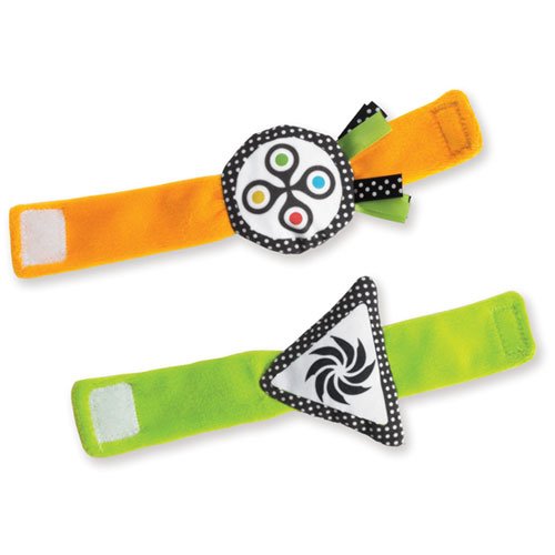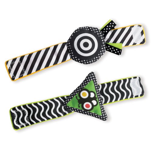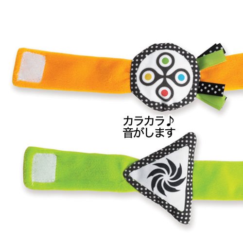 上手にものを握れない赤ちゃんの為の腕に巻きつけるリストラトル(ガラガラ)です。リストラトルは、まだ自分でラトルを握ることのできない『ねんねの頃』の赤ちゃんにオススメです♪ カラフルな色と、白黒のリバーシブルになっています。 生後0-2ヶ月頃の赤ちゃんには、はっきりと認識しやすい白黒のベルトが使われています。リストラトルを手首に巻いてあげると、はっきりとした色や音の刺激が赤ちゃんの好奇心をくすぐり、手を動かす一歩を応援してくれます。 生後2-3ヶ月の赤ちゃんが、自分の手を発見する『ハンドリガード(※)』においても大活躍! マジックテープは、皮膚が薄く肌のやわらかい赤ちゃんにも安心な安全タイプが使用されています。 (※)ハンドリガード:動作と感覚がまだつながらない赤ちゃんが、自分の手を見つめたり、合わせたりすることで、手を動かすことを覚えていく成長段階です。 【■Wimmer-Ferguson(ウィマー・ファーガソン)シリーズ】 『ウィマー・ファーガソン』シリーズは、赤ちゃんにとってコントラストの強い色合いが最も見やすいという研究から、世界で初めて赤ちゃんの視覚を理解してつくられた『白・黒』をデザインを用いたおもちゃです。色のコントラストや輪郭のはっきりしたものが見えやすい赤ちゃんの為に『白黒の模様』や『曲線・幾何学模様』が多く使われています。デザインに用いられている『顔』や様々な『模様』は、赤ちゃんに見えやすく『何度も同じものをみることで親しみを覚え、よく見る』という脳のしくみから生まれたものです。