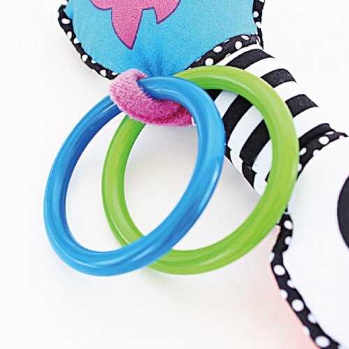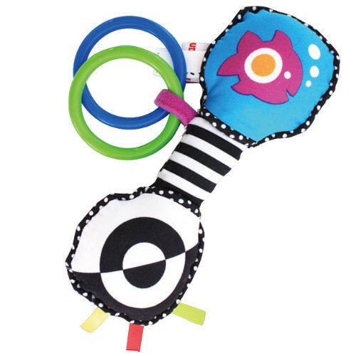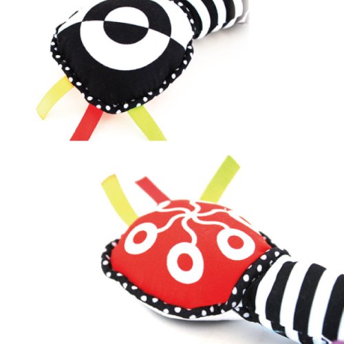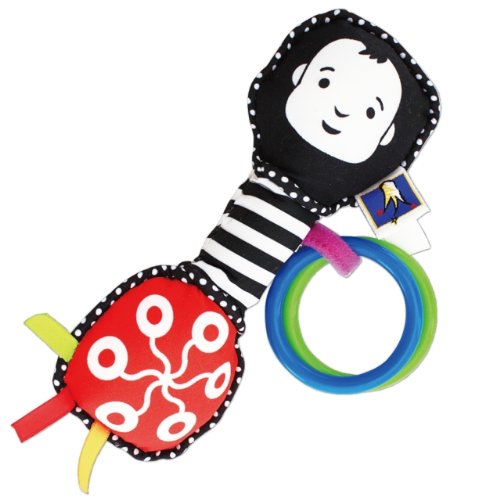 裏表で異なる絵柄で、『握る場所』を認識しやすい形のラトル(ガラガラ)です。 ラトルには、裏表にそれぞれ赤ちゃんの興味をひきやすい『顔』『的』『曲線』がデザインされています。赤ちゃんが大好きな『顔』のデザインで『いない・いない・ばぁ』遊びも楽しめます♪ じっと見つめる動作から、手を上手に動かす次の遊びのステップへつながるラトルです。 【■Wimmer-Ferguson(ウィマー・ファーガソン)シリーズ】 『ウィマー・ファーガソン』シリーズは、赤ちゃんにとってコントラストの強い色合いが最も見やすいという研究から、世界で初めて赤ちゃんの視覚を理解してつくられた『白・黒』をデザインを用いたおもちゃです。色のコントラストや輪郭のはっきりしたものが見えやすい赤ちゃんの為に『白黒の模様』や『曲線・幾何学模様』が多く使われています。デザインに用いられている『顔』や様々な『模様』は、赤ちゃんに見えやすく『何度も同じものをみることで親しみを覚え、よく見る』という脳のしくみから生まれたものです。