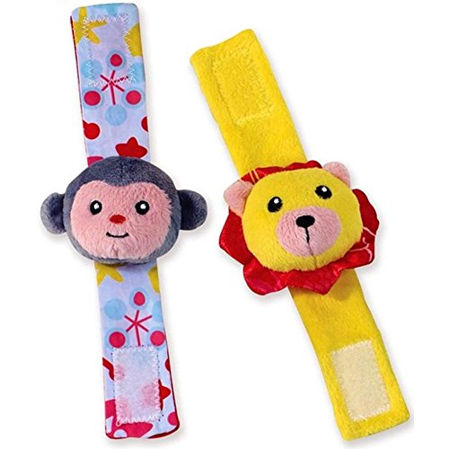 お猿さんや象さんの顔のデザインがポイントの、手首に巻きつけて遊べる楽しいリスト・ラトル。ベルクローで付け外しが簡単。触るとガサガサっと音がするペーパーが特徴。