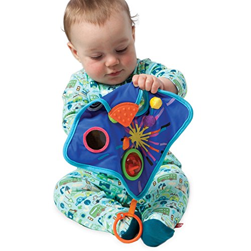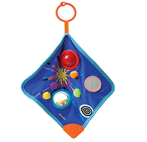 Colorful blankie has two spinning rattle balls, discovery mirror and teething corner. Features clip for attachment to strollers and carriers. Fosters development of fine motor skills and teaches cause and effect. Stretchy material for baby to grasp and pull. Suitable from birth.