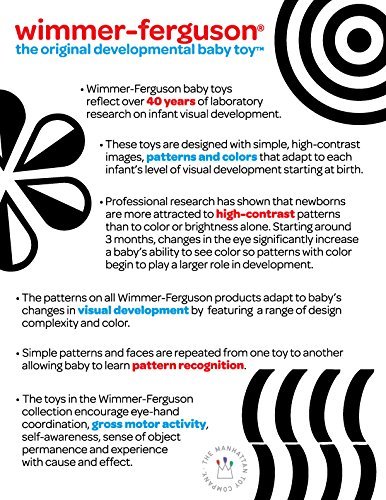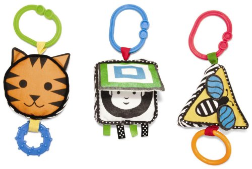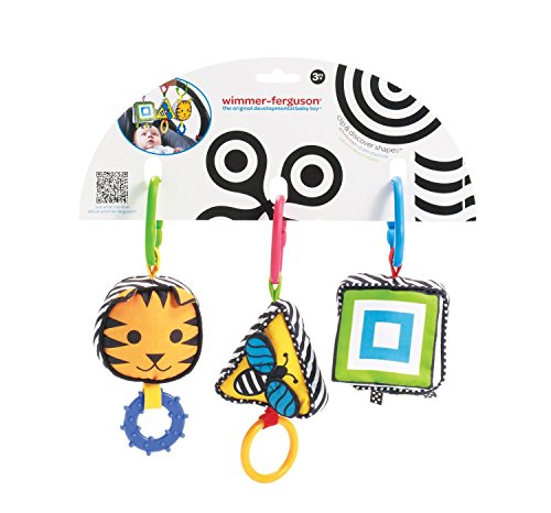The Clip and Discover Shapes activity set is a perfect travel toy designed with a variety of multi-sensory features to engage your baby at home or on the go. Rattles, hidden squeakers, and soothing sounds all teach auditory cause and effect. Various textures, teethers, and pull cords engage your baby’s tactile senses, while the hidden mirror and the bright, contrasting images visually engage baby. Each of the three unique Clip and Discover Shapes includes a clip for easy attachment to strollers, car seats, infant carriers, cribs and changing tables. Wimmer-Ferguson toy graphics and designs are based on scientific research of visual development in early infancy. Each Wimmer-Ferguson toy is designed to engage baby from birth, providing playful opportunities to practice developmental skills. All toys feature high contrast graphics to encourage early visual activity and graphics are repeated from toy to toy to encourage “pattern recognition”. In addition to visual development, the Wimmer-Ferguson collection by Manhattan Toy also offers a variety of toys with features to benefit other key areas of an infant’s developmental growth including: eye-hand coordination, gross motor activity, self-awareness, sense of object permanence, and experience with cause and effect. For over 30 years, Manhattan Toy has been making award winning, high quality, visually appealing toys for babies, toddlers, and kids. Manhattan Toy offers more than 500 exclusive, original product designs distributed and sold worldwide through specialty retail stores, catalogs and websites. All of our products, from the newest concepts to our time-tested classics, are innovatively designed to inspire imaginative play and delight our customers.