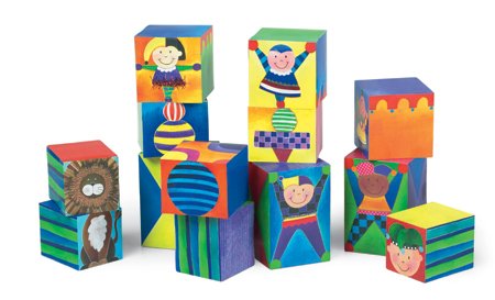This 13-piece set is a puzzle and block set all in one Match the characters to complete a puzzle or stack the blocks into fun and creative designs. Made of sturdy grey board. This block set includes blocks of 4 different sizes with the larges 4.5" H. Ages 18+ months.