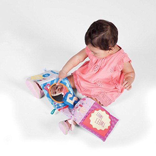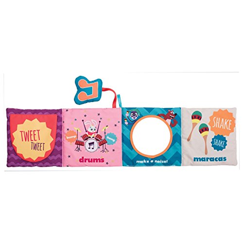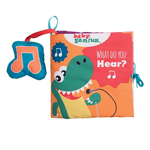 The What Do You Hear Soft Activity Book is perfect for little hands and encourages learning through repetition and developing coordination skills. Each panel features a unique musical sound. Press the soft covered musical note attachment to hear five different sounds corresponding with the images on the book panels. The soft book uses different textures throughout for a great tactile experience. Book also has flip up pieces for a peek-a-boo experience, a record that 'spins' and a peek-a-boo mirror. Folds easily and has ribbons to tie it shut and a loop for easy attachment to strollers and carriers. Includes non-replaceable batteries. The Baby Genius Learn & Grow program has been developed to correspond to five stages of natural growth. The What Do You Hear soft activity book is part of the Discoverer stage (6-12 months) featuring products that encourage self-discovery.