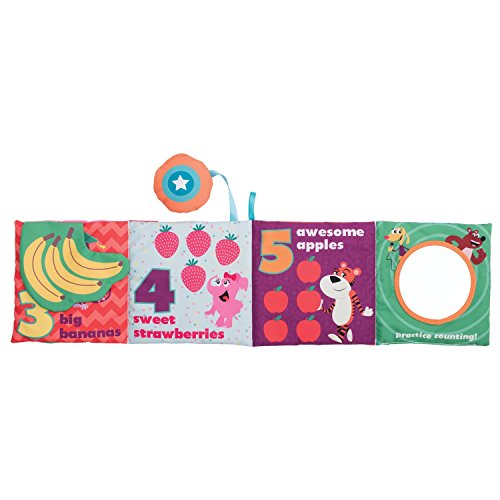 The 1-2-3 Count Soft Activity Book is perfect for little hands and encourages learning through repetition and developing coordination skills. Each panel features a number and corresponding number of fruits or vegetables. There is also an attachment piece that when pressed will call out five different sayings that correlate to the number of fruits or vegetables. The soft book uses different textures for a great tactile experience and has a peek-a-boo mirror. Folds easily and has ribbons to tie it shut and has a loop for easy attachment to strollers and carriers. Includes non-replaceable batteries. The 1-2-3 Count Soft Activity Book is part of the Discoverer stage (age 6-12 months) featuring products that encourage self-discovery.