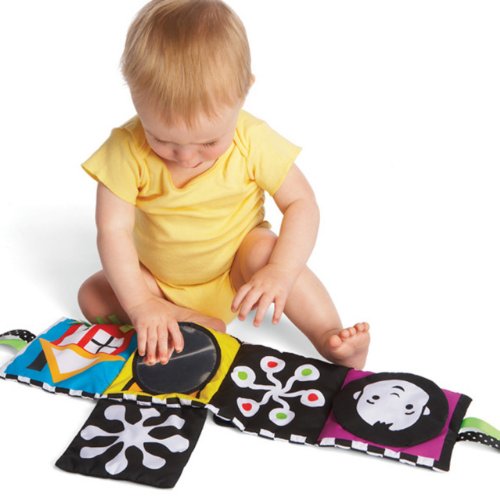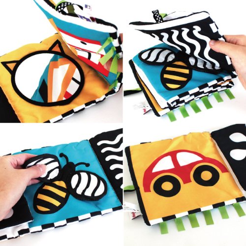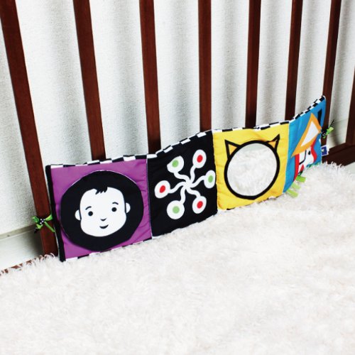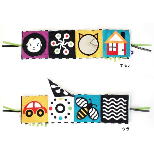 手遊び・見る遊びがいっぱい!ベビーベッドにも取り付けられる布絵本です。赤ちゃんの視覚の発達を促すハッキリした色使いと図柄で、めくったり、ひっぱったりと手遊びを促進するしかけも付いています。 布絵本はジャバラ型に開き、両脇についているリボンでベビーカーのバーや、ベビーベッドに取り付ける事ができます。ミラー(安全鏡)や音の出るしかけ等、たくさんの楽しい機能が赤ちゃんを飽きさせません! 『めくる』動きや音だけでなく、『いない・いない・ばあ』のように絵柄の変化も楽しめます。 じっと見つめる動作から、手を動かしたいという次の遊びのステップへつながる布絵本です。 【■Wimmer-Ferguson(ウィマー・ファーガソン)シリーズ】 『ウィマー・ファーガソン』シリーズは、赤ちゃんにとってコントラストの強い色合いが最も見やすいという研究から、世界で初めて赤ちゃんの視覚を理解してつくられた『白・黒』をデザインを用いたおもちゃです。色のコントラストや輪郭のはっきりしたものが見えやすい赤ちゃんの為に『白黒の模様』や『曲線・幾何学模様』が多く使われています。デザインに用いられている『顔』や様々な『模様』は、赤ちゃんに見えやすく『何度も同じものをみることで親しみを覚え、よく見る』という脳のしくみから生まれたものです。